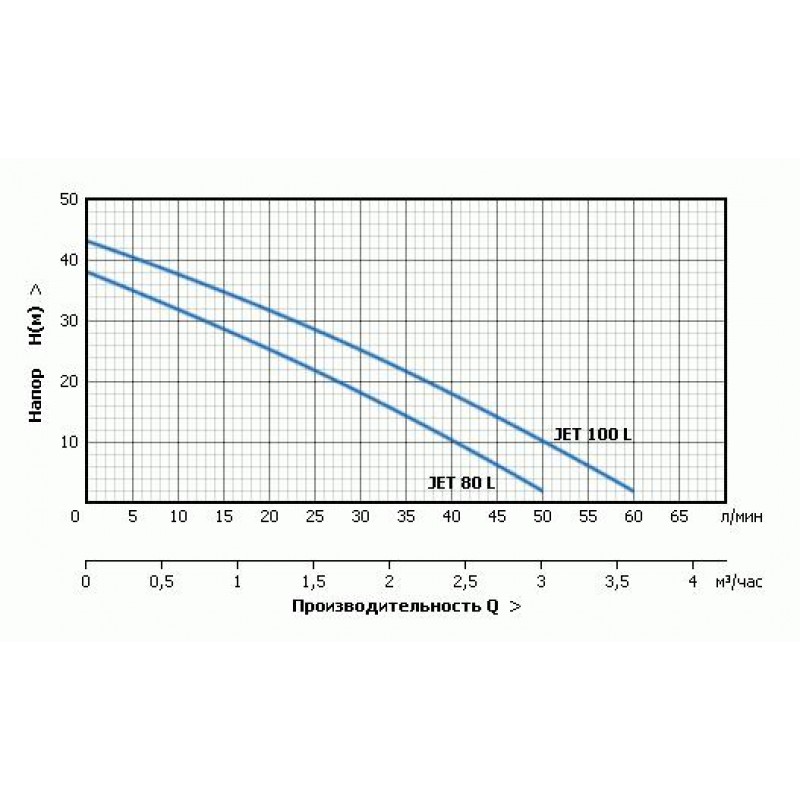 | JET 80 L | 0.6 | Напор, Н(м) | 38 | 32 | 25 | 18 | 10 | 2 | - | - |